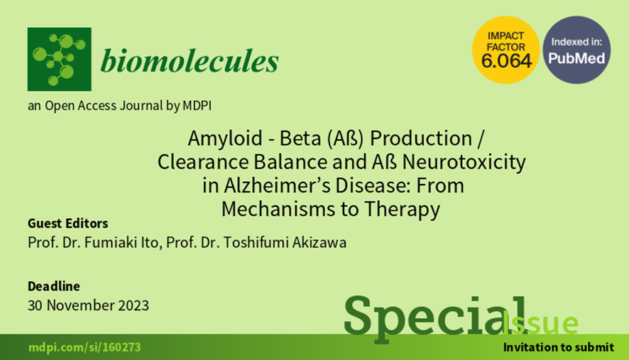 英文雑誌「biomolecules」の特集号「アルツハイマー病の原因と治療法の開発」のゲスト・エディターを予防薬理学研究所・分子機能解析室の伊藤文昭が担当することになりました。